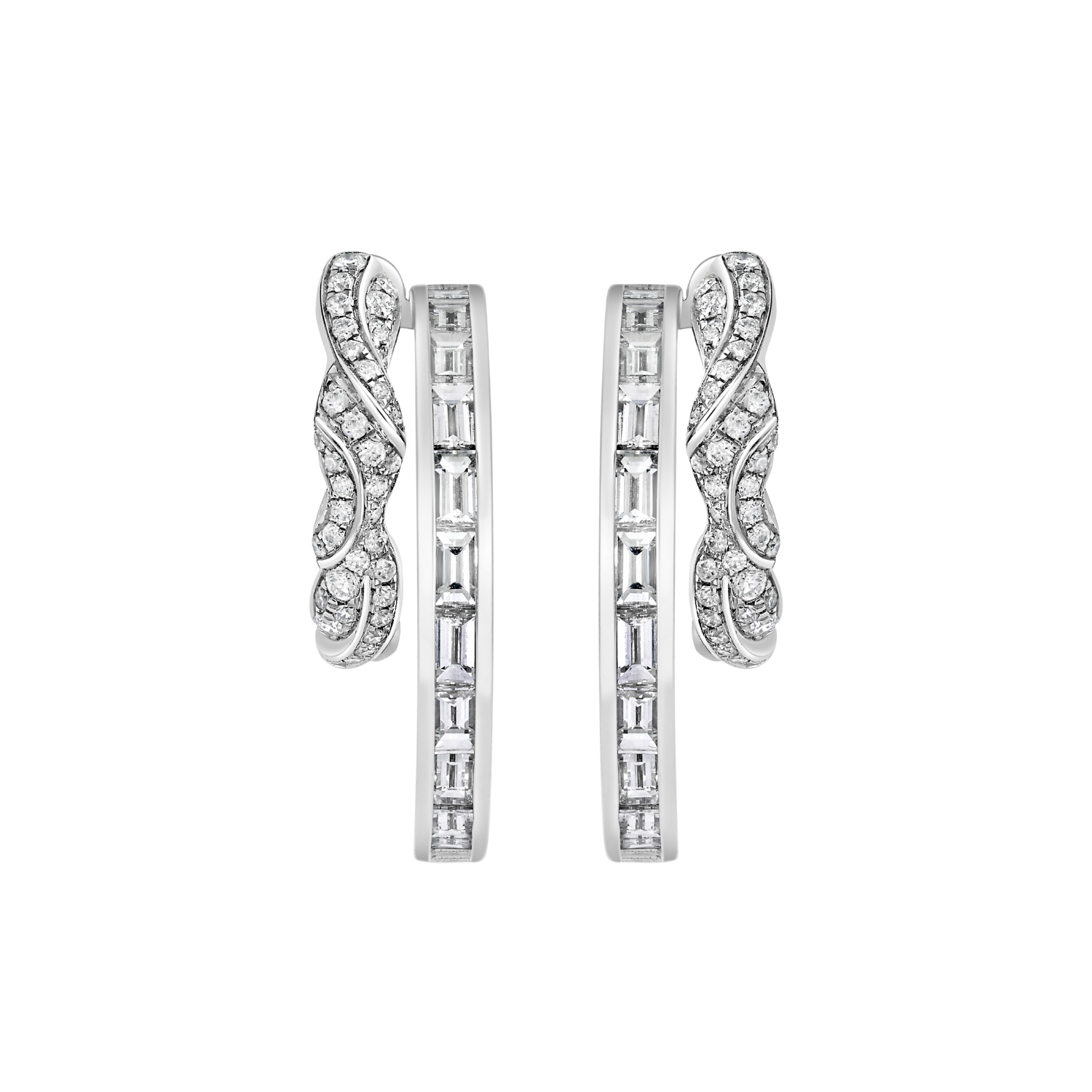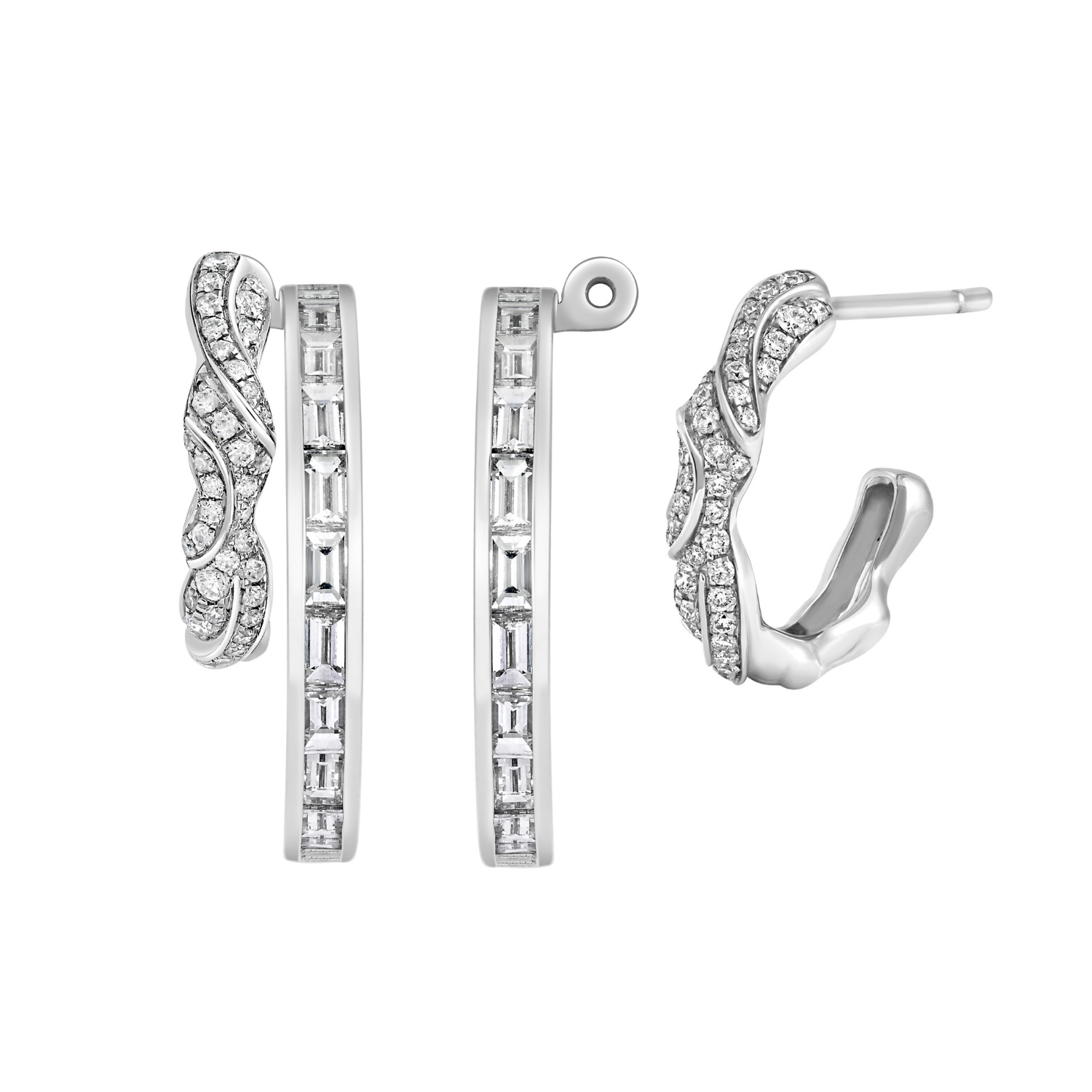 Designed to capture light from every angle, these double hoop earrings pair a sculpted wave hoop traced with pavé-set diamonds with a larger hoop with channel-set baguette diamonds. The clean geometry of the baguette cut offers a refined, architectural contrast to the fluid wave form, creating a look of understated elegance and brilliance. The wave hoop is removable and can be worn alone as a single hoop for versatile styling.