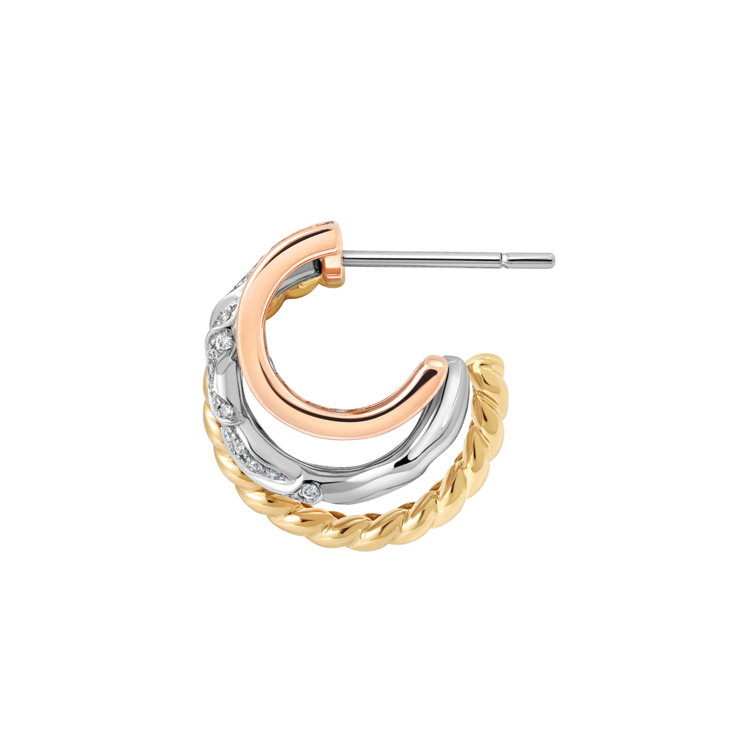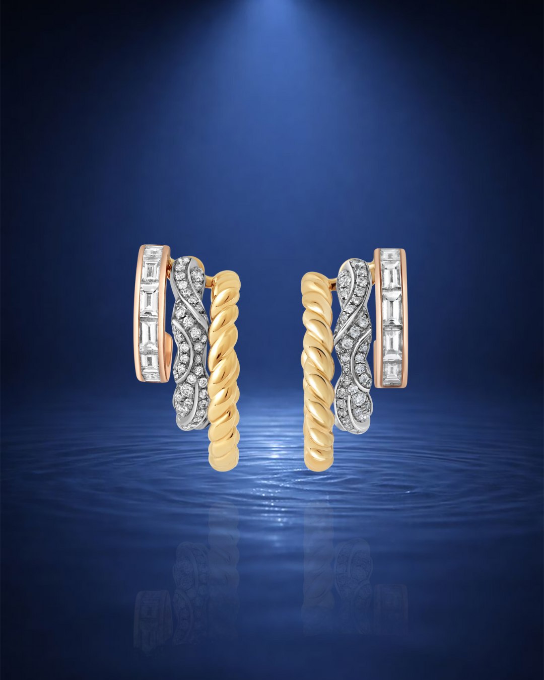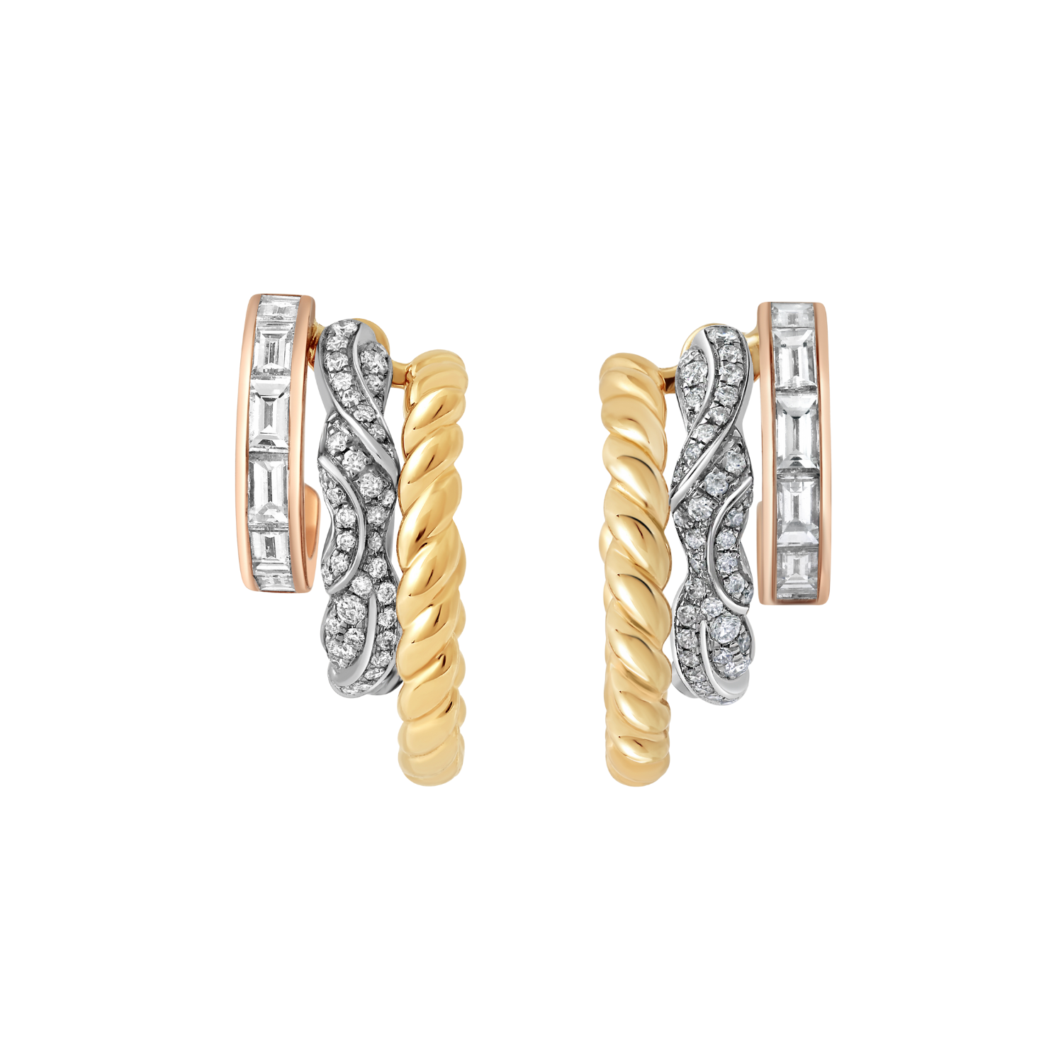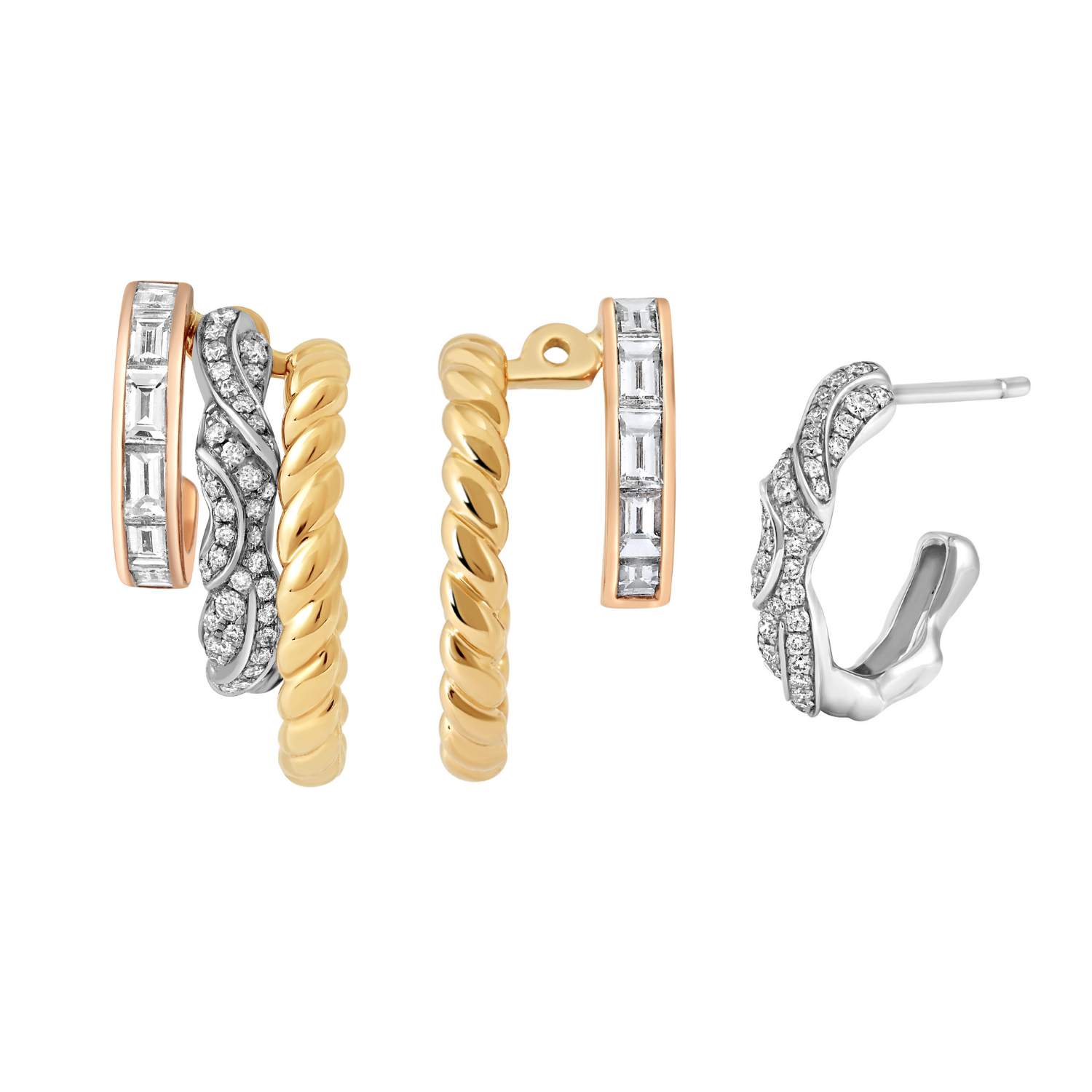 A bold expression of movement and brilliance, these triple hoop earrings layer a diamond-set wave hoop with a baguette-set hoop and a larger hoop shaped like a rope - creating the illusion of triple piercings. The wave hoop is removable and can be worn alone as a single hoop, offering multiple ways to style a striking, dimensional silhouette.