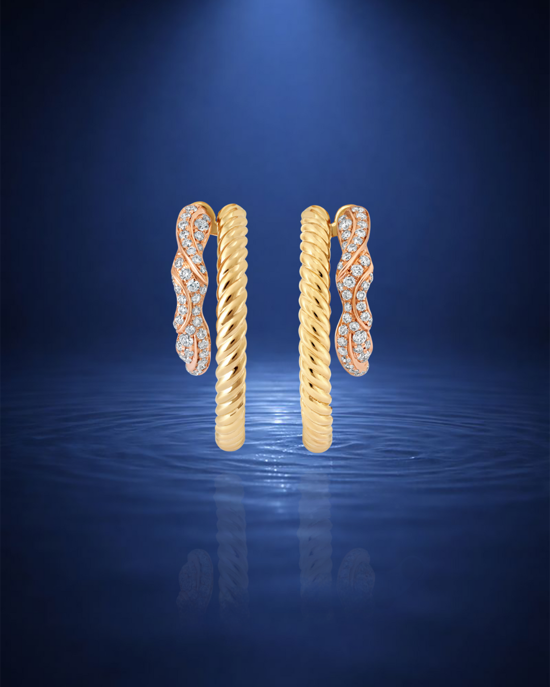 Inspired by the rhythm of the sea, these double hoop earrings combine a diamond-set rolling wave hoop with a polished rope-textured larger hoop. The removable wave hoop offers styling flexibility, allowing it to be worn solo or layered for a refined, sculptural look.