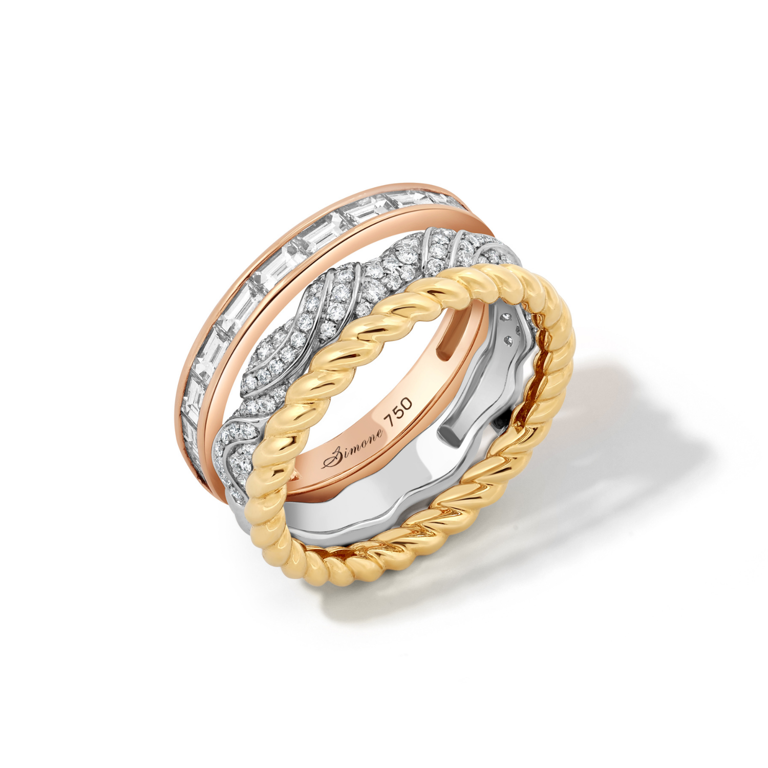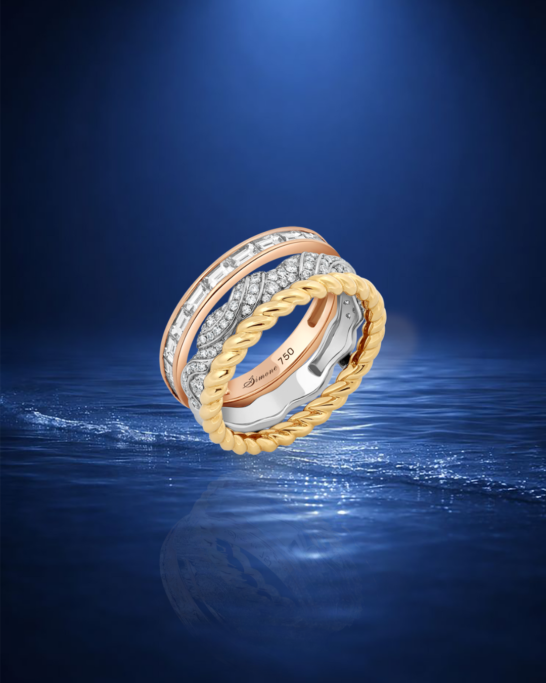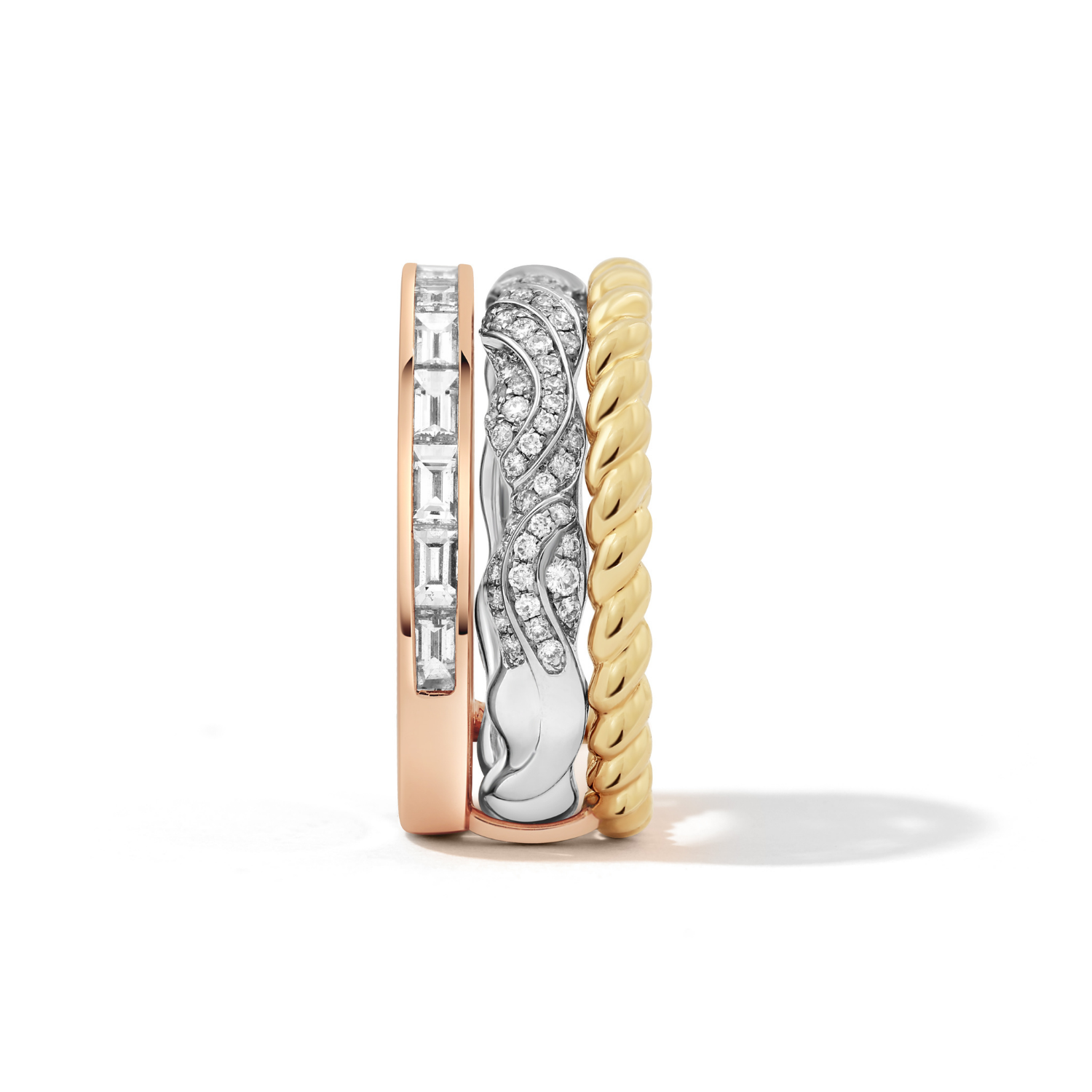 Classic bands with a twist. Drawn from the High Jewellery collection inspired by Hokusai’s The Great Wave off Kanagawa, this triple ring plays with contrast through sculpted wave forms, fishermen’s rope textures, and channel-set baguette diamonds - a moment of calm within the movement.